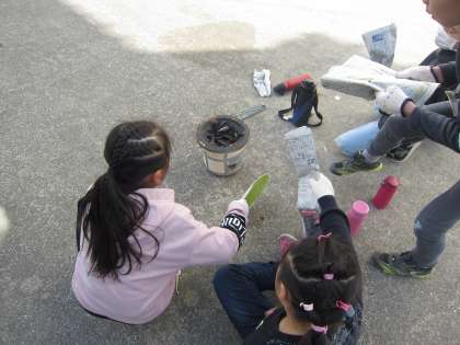 3年生が総合的な学習の時間に「昔の人のくらし」を学習しています。今日は、七輪を使ってお餅を焼くという体験学習を行いました。みんな協力して火をおこし、上手にお餅を焼いていました。