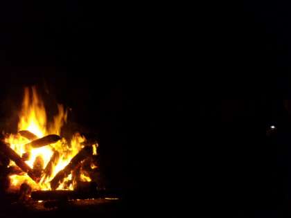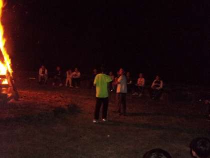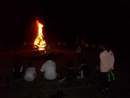 キャンプファイヤー係によるさまざまなアトラクションがあり、みんなで楽しく取り組みました。そして、ちょうど終わる頃に、火も消えるように崩れました。