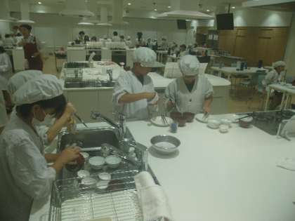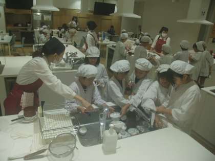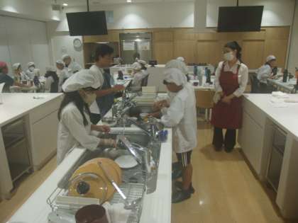 ごちそうさまでした。おいしく、いただきました。自分で使った食器を、班で協力しながら、洗う人と食器をふく人に分かれて、取り組むところもありました。