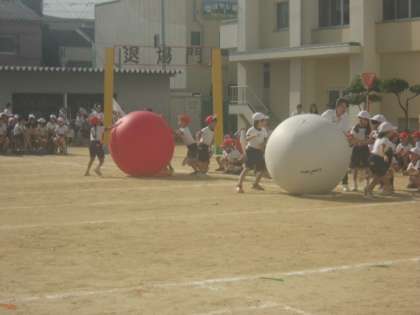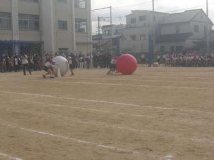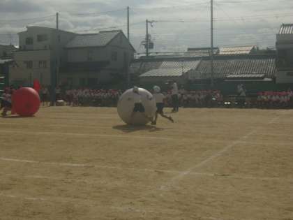 2年生の「大玉ワッショイ!!」です。自分の体よりもはるかに大きい大玉を、2人で転がします。うまく運ぶことができたかな?