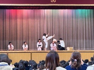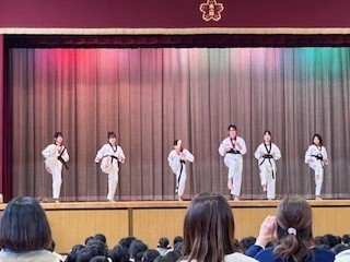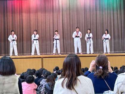 最後は、6年生の女子によるテクォンドーです。あいさつから始まり、次々と型を披露していきます。そして、一人ずつ気合を入れて、足で板を割っていきます。