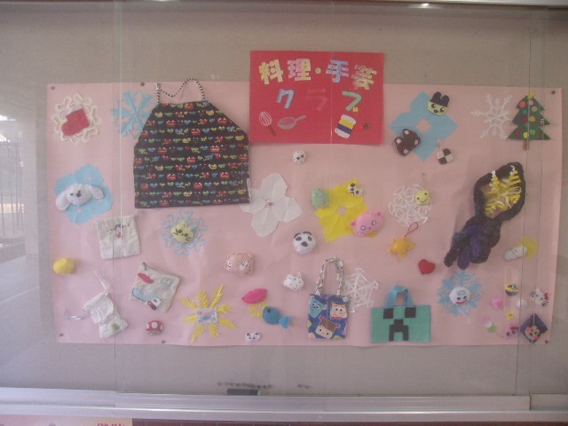 また、玄関の横の掲示板に、料理・手芸クラブの作品が掲示されています。来週12月15日(月)から学期末保護者懇談会が始まりますが、よかったらご覧ください。