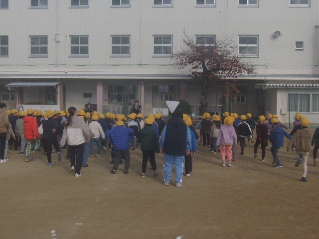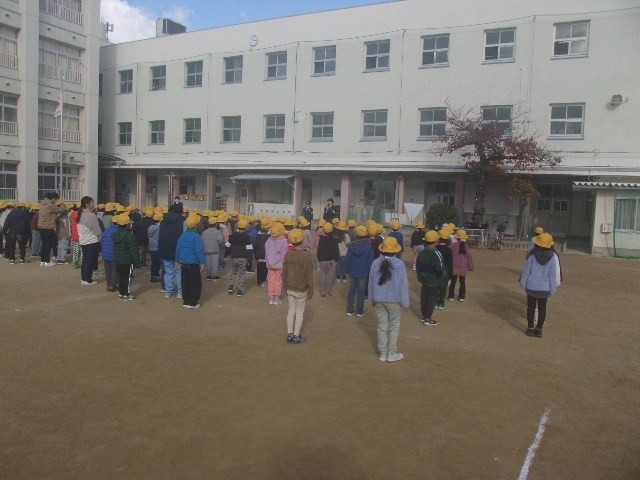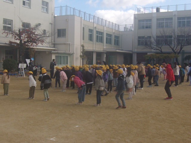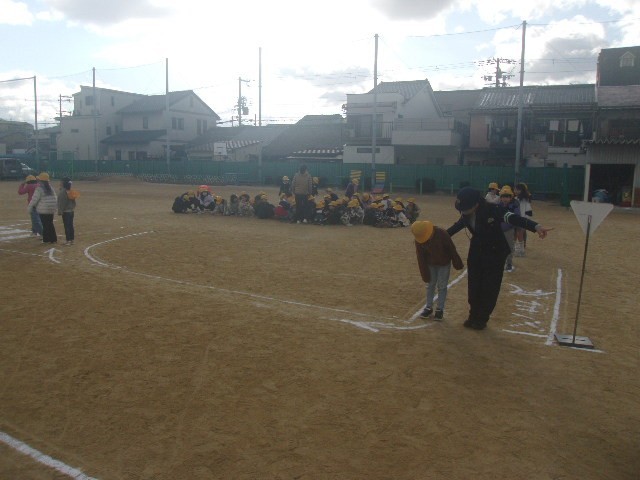 運動場に白線を引き、歩道を設定し、簡易信号機も設置して、一人ずつ歩いて行きます。先ほど教えていただいたことを思い出しながら、取り組んでいきます。最後に、もう一度集まって、体を使っての確認とクイズもやって、低学年の部が終了しました。