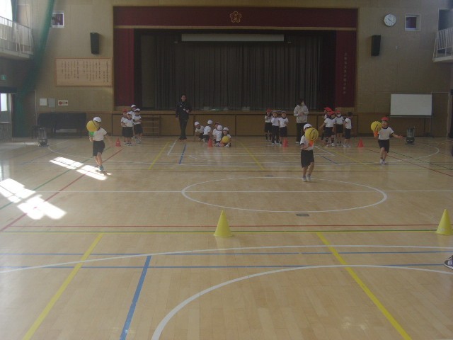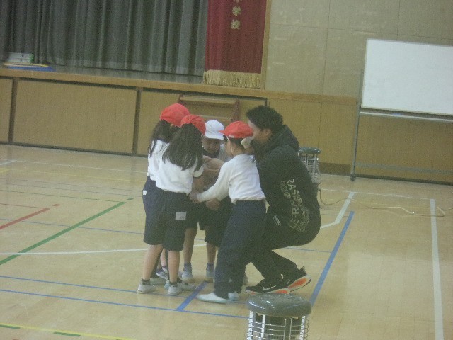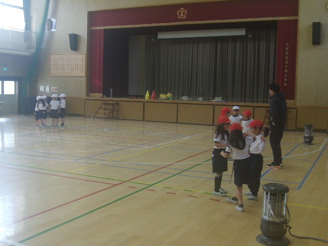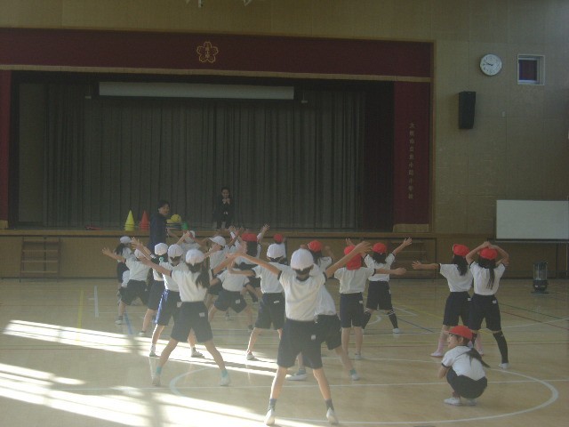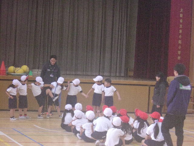 1月28日(水)の2時間目、講堂で、1年生は「体つくり運動」を行いました。これは、生野区の「生きるチカラまなびサポート事業」のリーフラスの職員の方2名に来校していただき、1年生に1クラスずつ指導していただきました。体のバランスをうまくとれるような体操から始まり、1年生の児童がわかりやすく、また楽しく取り組める運動を行いました。最後は、ボールをうまく扱えるようなゲーム性のリレーで、終わりました。