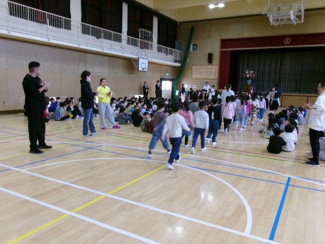 4月9日(木)午前8時40分より講堂で、「1年生を迎える会」を行いました。前日の始業式では、2~6年生は一堂に会しましたが、1年生と一緒に集まるのは今回が初めてです。