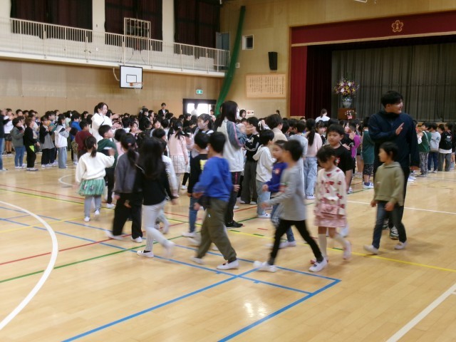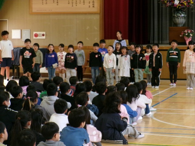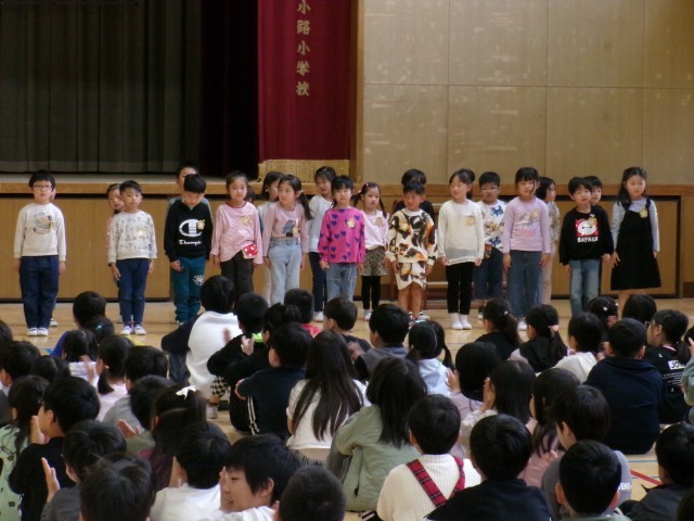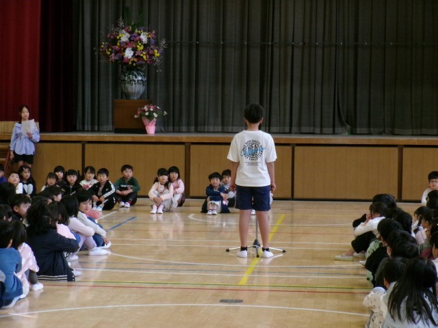 続いて、児童会の代表から1年生にお祝いのメッセージを発表して、それに対して1年生も元気よくお返事をしました。