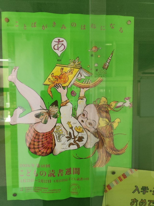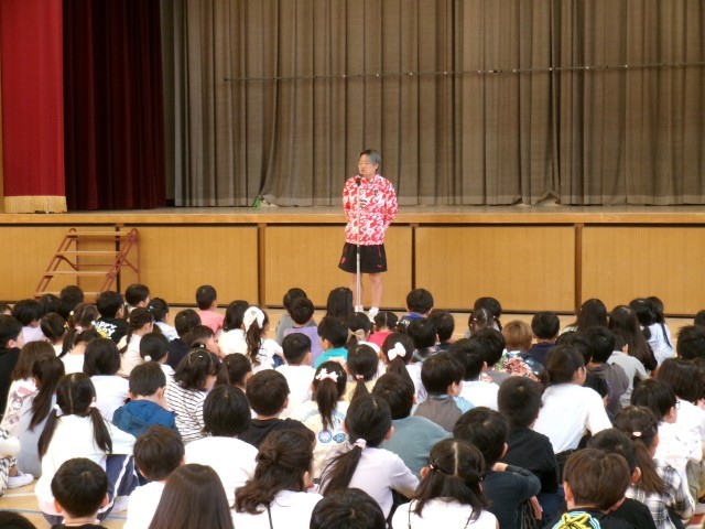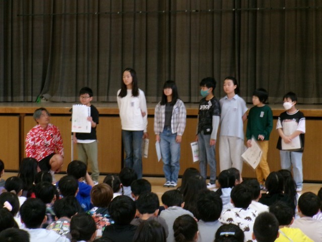 まず初めに、学校長からは、4月23日から5月12日までが「こども読書週間」であり、今年度のテーマが「ことばがきみのはねになる」であることを伝えて、この期間に1冊でもいいから絵本や本を読んで、友だちやなどにその本の内容を伝えられるようになりましょう、と呼びかけられました。