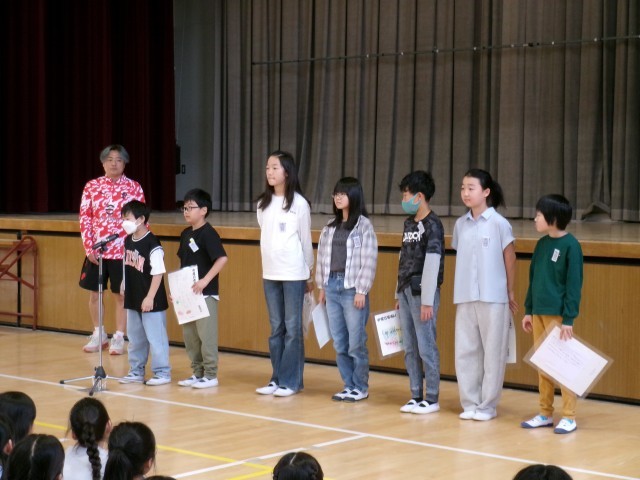 最後に、朝会担当の先生からは、近くの学校で見かけた言葉「陽口(ひなたぐち)」についての話をされ、陰口を言うのではなく、その反対の相手をほめる言葉かけをしていきましょう、と呼びかけられました。