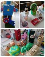夏休みの作品が図工室に集められています。 写真は、1年生の工作の作品です。