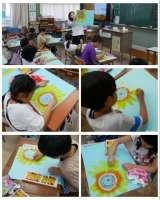 1年生は、パスを使ってひまわりの絵を描いていました。オレンジ色と黄色のパスを上手...