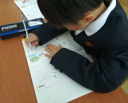 えんぴつの持ち方や姿勢に気を付けながら、運筆の練習をしている様子です。