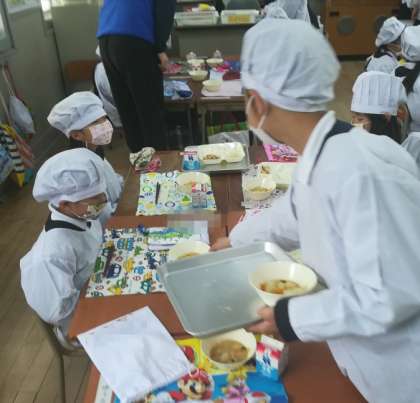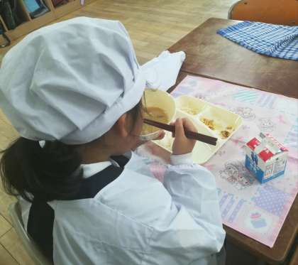 6年生のお兄さん、お姉さんが給食の準備をしてくれています。みんなで食べる給食はとても美味しく、苦手なものも残さずに食べています。