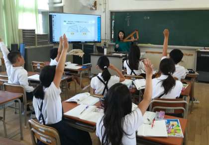 「角の大きさの表し方を考えよう」の単元を学習しました。デジタル教科書を大型電子黒板に映して、手元にある三角定規と見比べながら角度を確認していきます。
