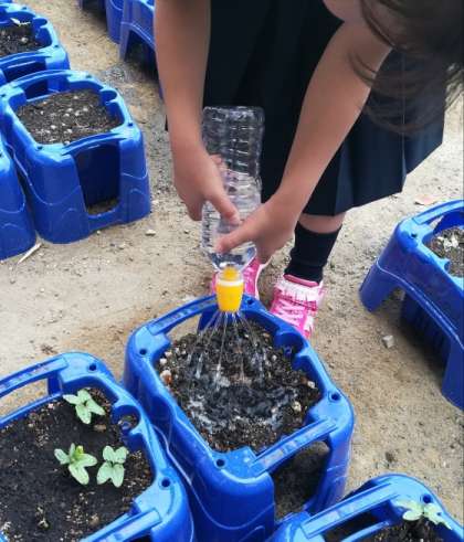 あさがおの小さな芽が育ってきました。1年生が毎朝、しっかりと水やりをしてくれているおかげですね。