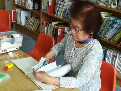 毎週水曜日は、朝の時間に地域の図書ボランティアの方々に来ていただいて、読み聞かせをしています。その後は、図書室に残って、こうして本の修理をしてくださっています。みなさんも本を大切に扱いましょうね。