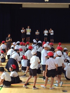 今日は、講堂で3年生・5年生ペア学年の児童集会がありました。