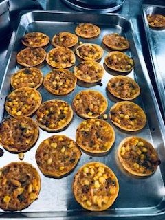 〇「変わりピザ」は、ツナ缶、コーン、ピーマン、ピザソース、チーズを混ぜ合わせて、ぎょうざの皮の上にのせ、焼き物機で焼く、人気の献立です。