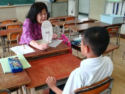 6月3日(月)の様子です。紙人形をお友達に見立てて、日常会話のフレーズを練習しました。