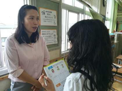 ‘What 〜 do you like?’ 「どんな〜が好きですか?」のフレーズを使って、ペアになって会話の練習をしました。写真は、児童がC-NETのニルファ先生の好きなものについて尋ねているところです。