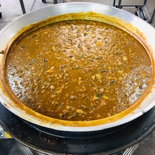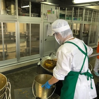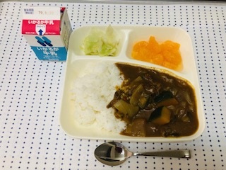 〇今日のカレーライスには、かぼちゃ、たまねぎ、ナス、トマト、ピーマン、セロリ、にんにくがはいっています。