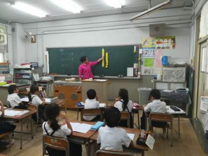 たしざんとひきざんの振り返りをしています。ブロックを用いて、数の概念をとらえやすくしています。