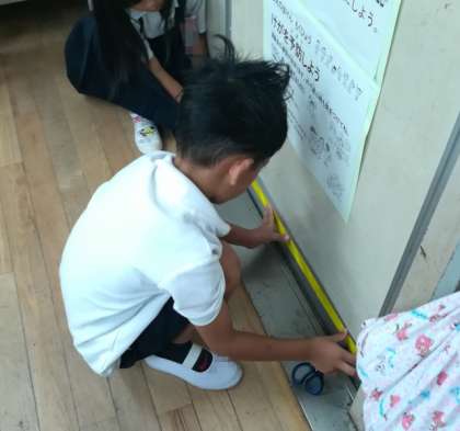 「どちらがながい」の単元を学習しています。教室の中のいろんなところをテープを使って測ってみました。立体的なものもこうすることで、簡単に長さを比べることができるようになりますね。