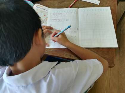 9月4日(水)の様子です。「計算のしかたをくふうしよう」の単元を学習しています。来日したての外国籍児童もこうしてみんなと混じって、同じ授業を受けています。板書が多い時は、薄く下書きしたものをなぞって学習したりしています。