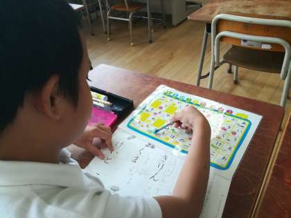手元のひらがなの練習プリントと五十音表を見比べながら学習しています。