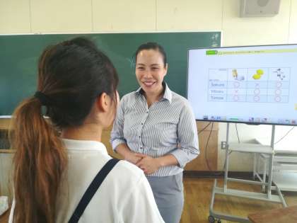 ‘I like apples.’ の単元を学習しています。実践的な会話練習を行いながら、I like 〜./I don’t like 〜. のフレーズが自然に口に出てくるよう繰り返しました。