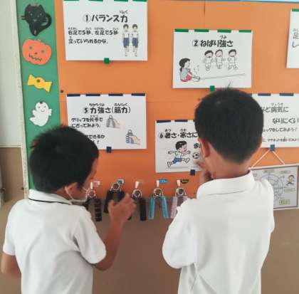母国語は異なりますが、同じ外国籍のお友達同士で一緒に学校探検をしました。保健室や給食室の掲示は、楽しくて役に立つものがいっぱいですね。