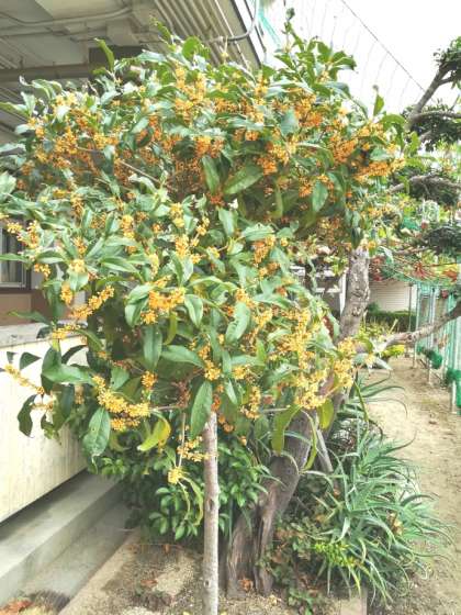 学校の敷地内には、様々な樹木が育っています。キンモクセイもかぐわしい香りを放っています。この香りも3〜7日の短い開花期間のみ感じることができるということなので、この季節ならではですね。