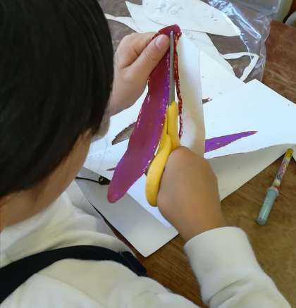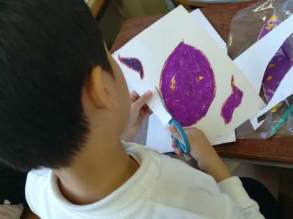 先日、絵の具を使って仕上げた土にのせる、さつまいもを切っています。作品展では、完成形をみなさんにお見せできるので、お楽しみに!