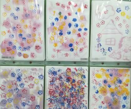 あさがおの花を絞った色水で絵を描いた上に、1年生の学習園で育てたオクラでスタンプして仕上げました。絵の具では出せない風合いが素敵です。