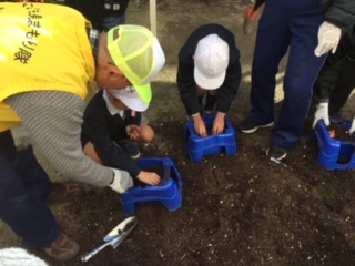 地域の方々とチューリップの球根の鉢植えを行いました。来年の春に綺麗な花を咲かせてくれるといいですね。