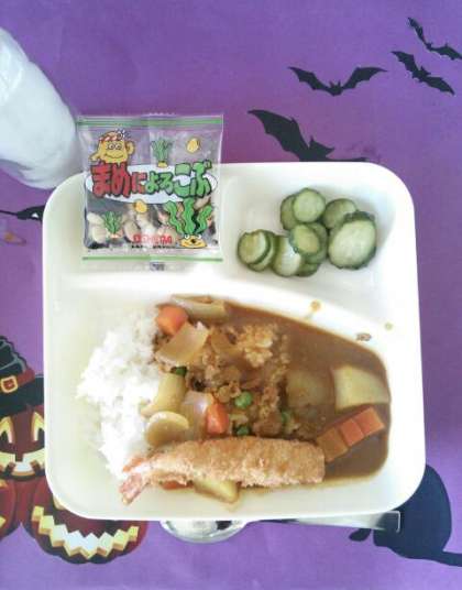 今日のカレーは、アレルギー対応で米粉のカレールウを使っています。