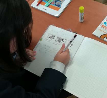 「□を使って場面を式に表そう」の単元を学習しています。どんな場面かを絵や線分図で示して、理解を促します。