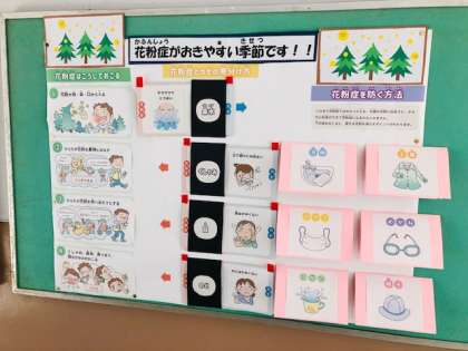 2月の保健室前の掲示は「花粉」をテーマにしたものです。