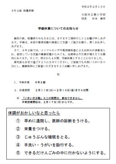 学級休業期間は、2月11日(火)〜2月14日(金)です。