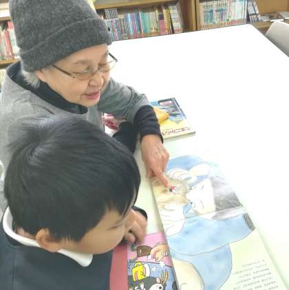 地域の図書ボランティアさんのおすすめの絵本、唯野元弘作「なんにもせんにん」を一緒に読みました。