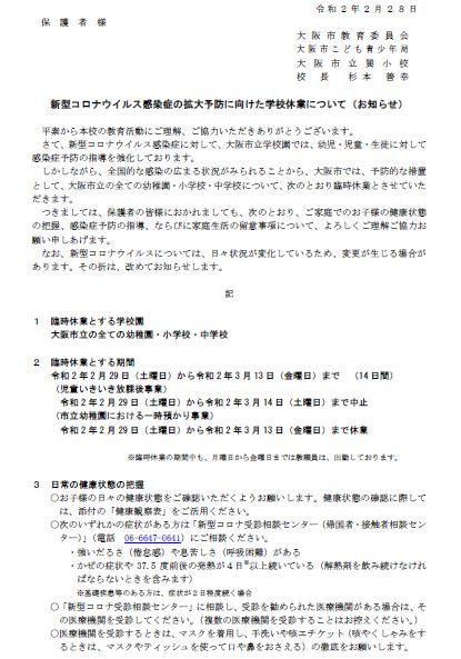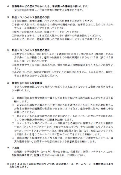 「新型コロナウイルス感染症の拡大予防に向けた学校休業について(お知らせ)」のお手紙です。