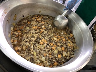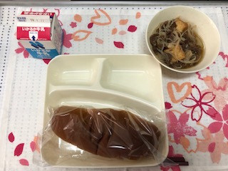 「すき焼き煮」は、牛肉、糸こんにゃく、あつあげ、たまねぎ、えのきたけを砂糖、みりん、塩、こいくちしょうゆであまからく味つけします。