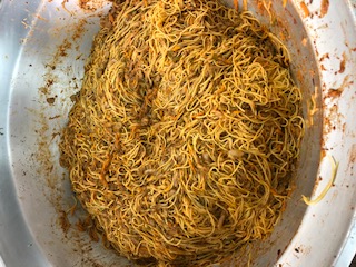 スパゲッティミートソースは、牛ひき肉、豚ひき肉を使い、小麦粉と綿実油をよくいためて作り、ブラウンルウでしあげます。