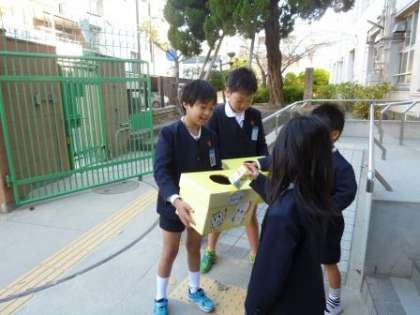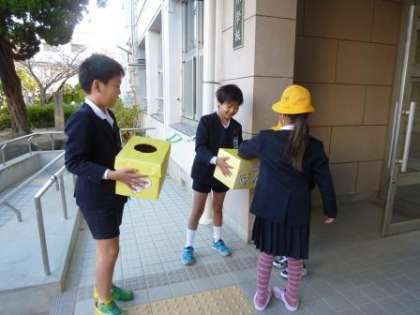 児童会の人たちが登校時に赤いはねの募金をしています。お小遣いの中から募金をしてくれている人がたくさんいるのが、嬉しいです。