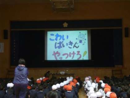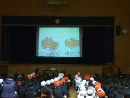 今日の児童集会は、保健委員会の発表でした。手を洗うことが大事なので、しっかり手洗いをしましょうという発表でした。また、上手な手洗いの仕方も発表してくれました。