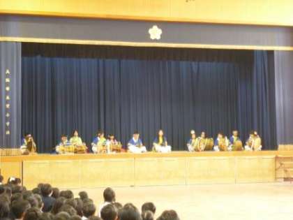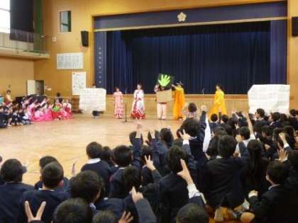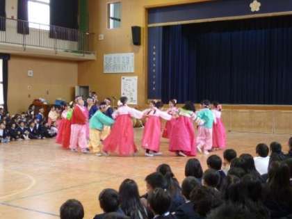 5時間目に民族クラブに参加している人たちが、踊りや演奏を発表してくれました。低学年はカンガンスㇽレという踊りを、高学年はサムㇽノリを演奏してくれました。
