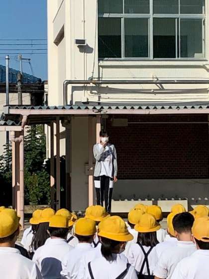 今日は、良い天気の下、運動場で「全校朝会」がありました。