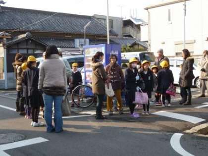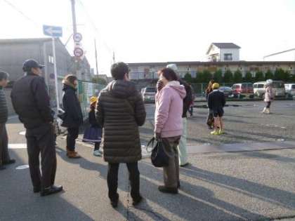震度6の地震がおきたということを想定して、学校に避難するために、第一次避難場所に集合しました。