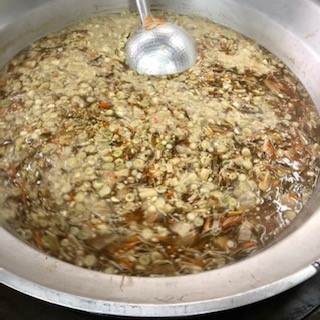 ソーキ汁は、ソーキ(豚のあぶら肉)をこんぶやだいこんなどと煮込んだ汁ものです。