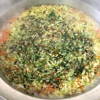 3.にんにく、牛ひき肉、豚ひき肉、たまねぎ、なすをいため、塩、こしょう、ケチャップ、トマトピューレ、ウスターソースなどで味つけし、1.の小麦粉とマカロニを加える。