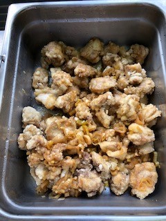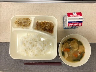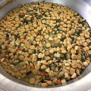 ●含め煮は、さといも、一口がんも、だいこん、にんじん、しめじ、青みにさんどまめを使用した煮ものです。